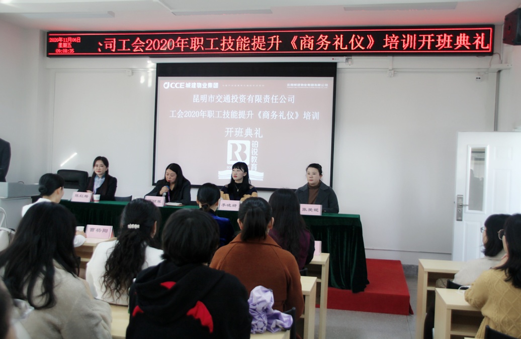 11月6日,昆明交投公司工會2020年商務禮儀職工技能培訓班在城建鉑銳學校舉辦,有208人參加了培訓。本期培訓嚴格執行云南省人力資源和社會保障廳云南省財政廳《關于發布2020年度職業技能培訓創業培訓補貼標準目錄的通知》(云人社通[2020]41號)》要求,分四個班,為期四天,具體時間為連續兩周中的周五、周六,是公司工會針對廣大職工舉辦的首次商務禮儀職業技能培訓班。