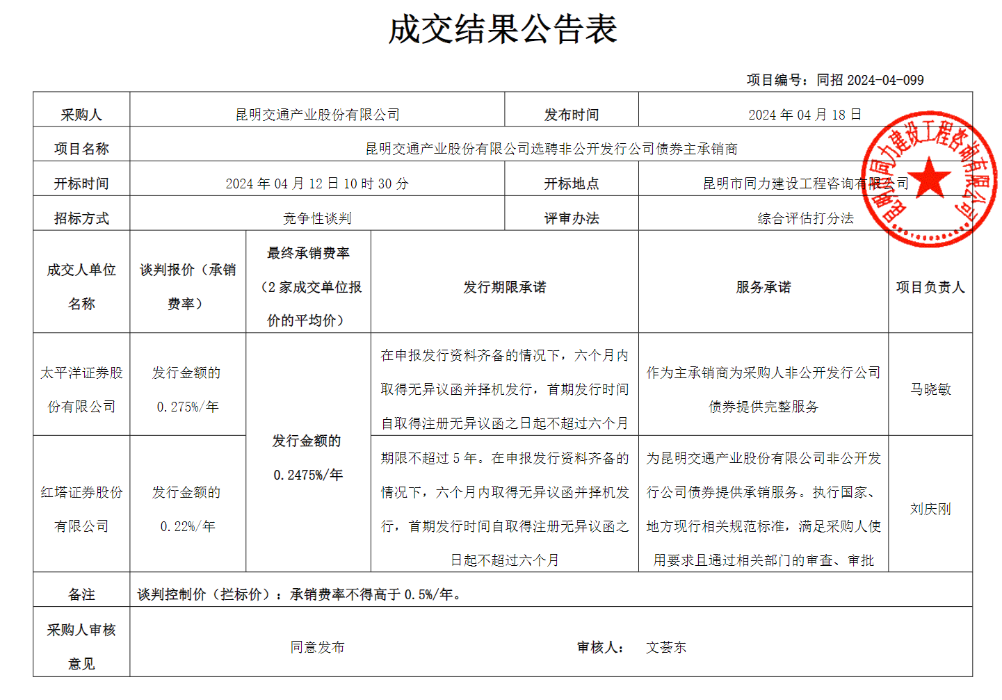 昆明交通產(chǎn)業(yè)股份有限公司選聘非公開發(fā)行公司債券主承銷商成交結(jié)果公告(4.18)