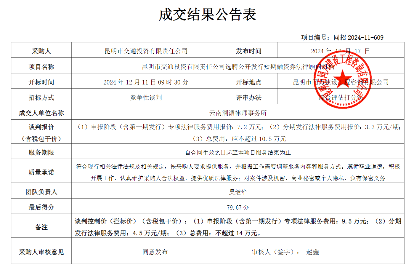 昆明市交通投資有限責任公司選聘公開發行短期融資券法律顧問機構成交結果? ? ? ? 公告